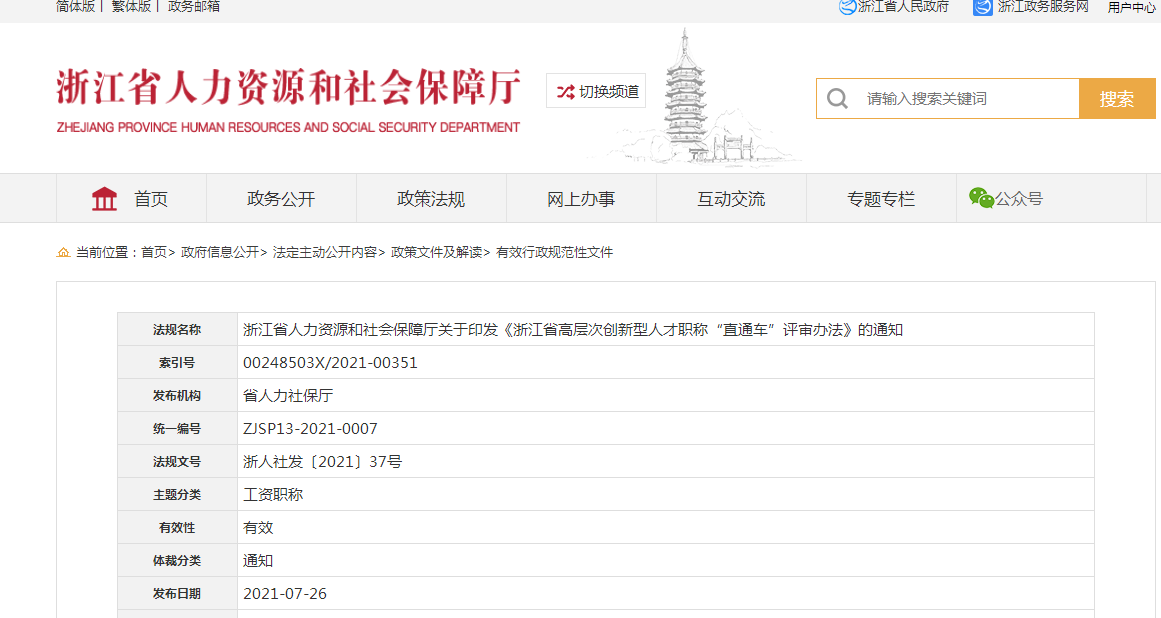 【浙江】浙江省人力資源和社會保障廳發(fā)布《浙江省高層次創(chuàng)新型人才職稱“直通車”評審辦法》(http://rlsbt.zj.gov.cn/): 一、 滿足下列條件之一者,可直接申報正高級職稱: