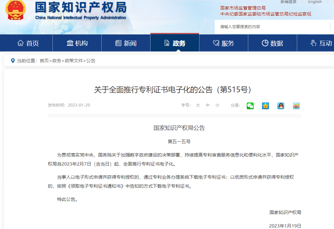 其中提到,為貫徹落實(shí)黨中央、國務(wù)院關(guān)于加強(qiáng)數(shù)字政府建設(shè)的決策部署,持續(xù)提高專利審查服務(wù)信息化和便利化水平,國家知識(shí)產(chǎn)權(quán)局自2023年2月7日(含當(dāng)日)起,全面推行專利證書電子化。