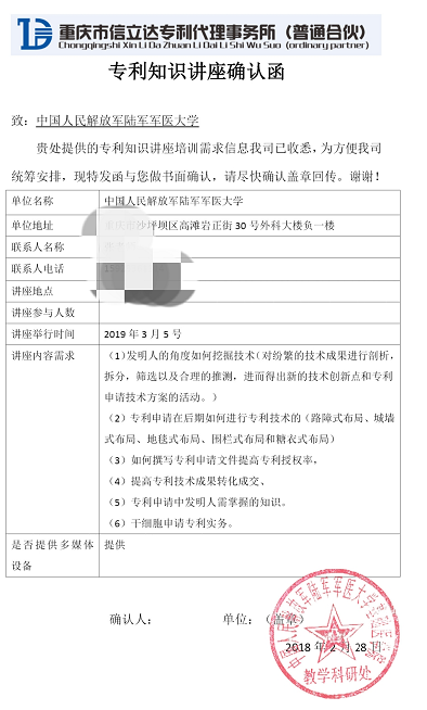 2019年3月5日重慶信立達在《中國人民解放軍陸軍軍醫大學》順利召開專利講座