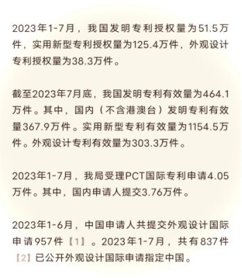 2023年1-7月我國實用新型專利授權量,同比外下降26.62%,發明專利同比少上升9.49%,發明專利授權率上升高峰期。